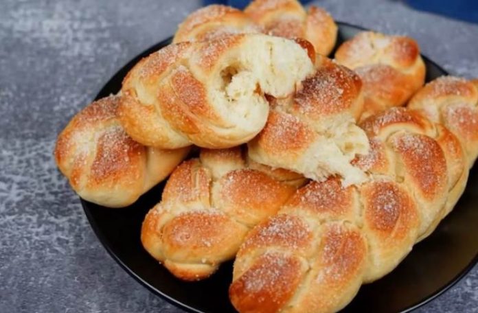 Кога ќе се формираат сите плетенки, префрлете ги во подготвениот плех и оставете 30 минути. Намачкајте ги плетенките со јајца и обилно посипете ги со бел шеќер. Печете на 190°C 15 минути.